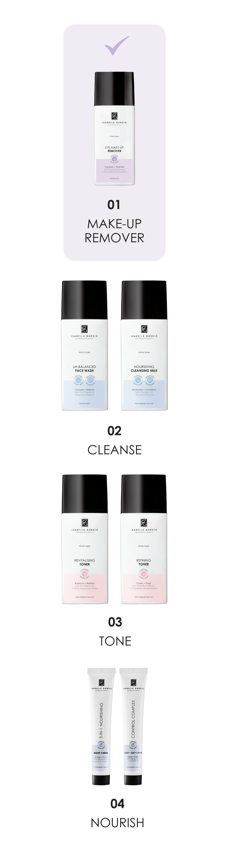 DIRECTIONS: In the evening, apply your make-up remover to your face and/or eye area using a cotton round or your ring finger and wait for a few seconds to allow the cleansing properties to take effect. Gently remove by wiping with a cotton round. Follow with your cleanser.
