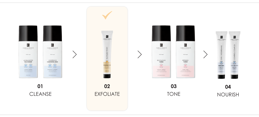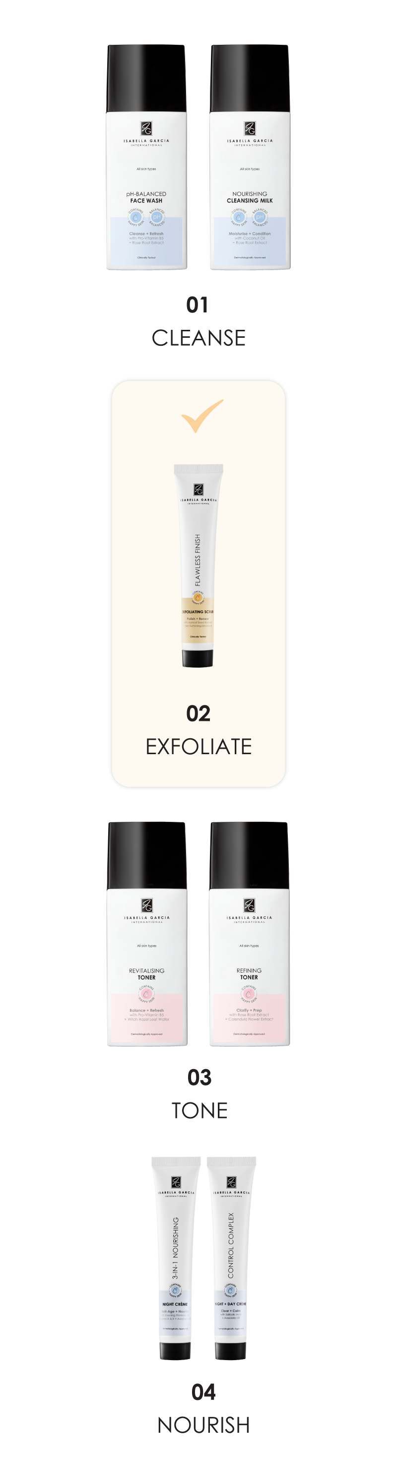 *IMPORTANT: Your Flawless Finish Exfoliating Scrub is a skin-exfoliating product and, therefore should not be used with any other exfoliant on the same day or more than 1-2 times per week.