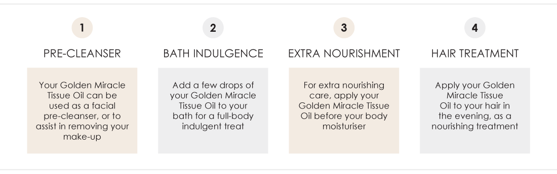 TIP: Add a few drops of your Golden Miracle Tissue Oil to your bath for a full-body indulgent treat!