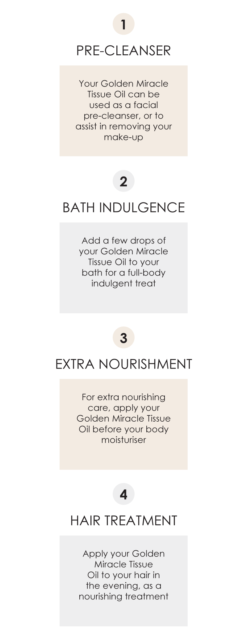 TIP: Your Golden Miracle Tissue Oil can be used as a facial pre-cleanser for dehydrated skin types or to assist in removing your make-up.