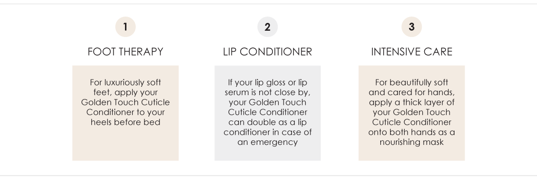 TIP: For luxuriously soft feet, apply your Golden Touch Cuticle Conditioner to your heels before bed.