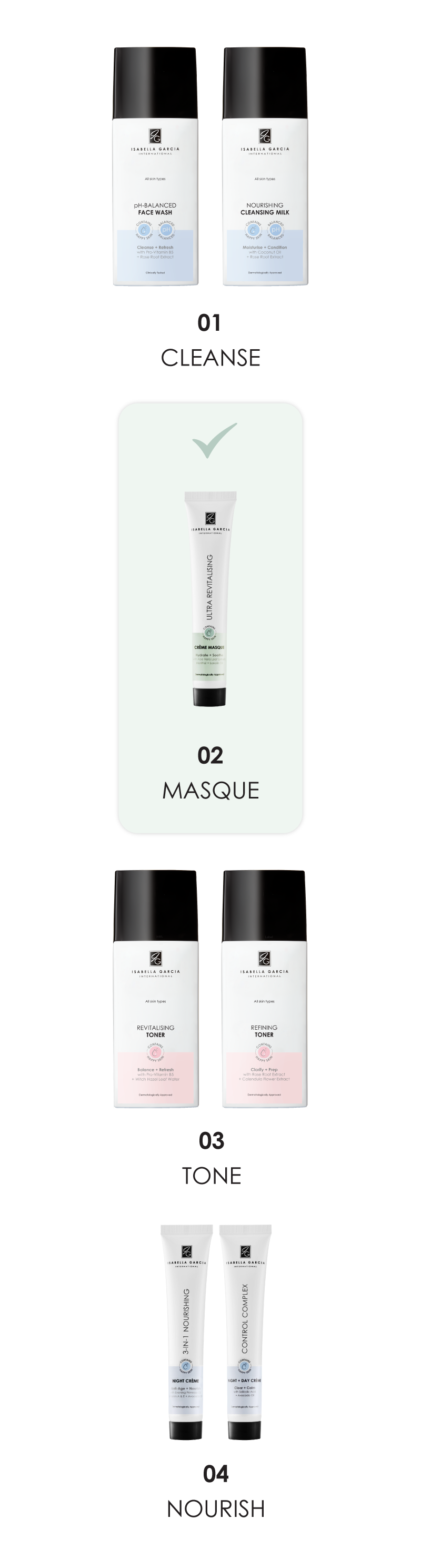 DIRECTIONS: 1-2 times per week, after cleansing in the evening, apply your masque to your dry or damp face, neck and décolletage, avoiding your eye area. Leave on for 5-10 minutes to help maximise the revitalising properties, before rinsing off with lukewarm water. Follow with your toner.